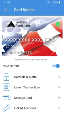 Solutions FCU CardControl puts you in control of your debit card usage. CardControl helps you protect you debit card by sending you transaction alerts and giving you the ability to define when, where and how your card is used. Simply download the CardControl app to your smartphone, then customize your alert preferences and usage settings to monitor and manage your card.